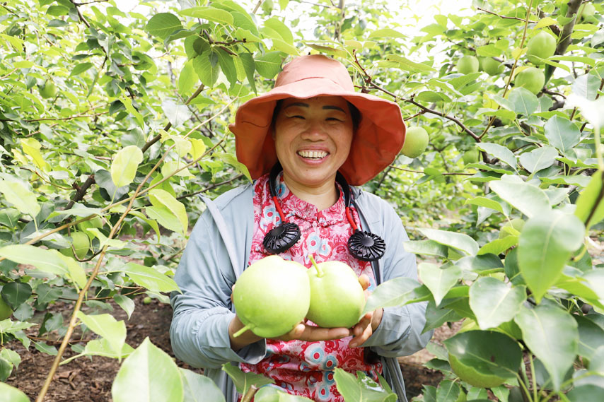 今年,金阳街道早酥梨种植面积达4000余亩,预计总产量超2000万斤,将为当地梨农带来近3000余万元收入。这颗盛夏的“黄金果”,正以科技甜度奏响乡村振兴“丰收曲”。 图为梨农王大姐捧着刚摘下的早酥梨,脸上满是丰收的喜悦。 (赵珊珊 张敏)