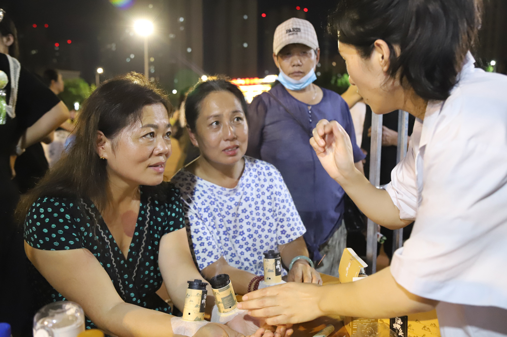 中医药展览区的道地药材、药食同源食材,让大家直观了解中药的形态与功效。志愿者们一边分发中医药科普宣传册,一边为驻足群众倒上清热解暑的中药代茶饮;趣味互动区里,辨识草药、制作香囊等活动,让大人孩子在互动中收获知识。本地中医药产业展示区内,展现了身边的中医药发展成果,更让人领略到传统医药在新时代的独特魅力。