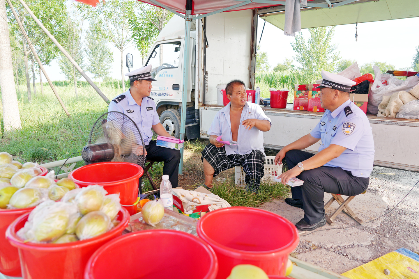 8月6日,阳信交警走进梨园,为广大梨农开展交通安全“精准宣传”活动。 宣传活动中,民警结合出行特点,通过面对面“拉家常”和发放宣传资料等方式共话交通安全。 下一步,阳信交警将持续靠前一步,主动作为,将服务阵地前移至田间地头,打好隐患排查、便民服务和宣传教育“组合拳”,全方位加强农村道路交通管理,为乡村振兴创造安全、有序、畅通的道路交通环境。(赵建磊 崔连喜)