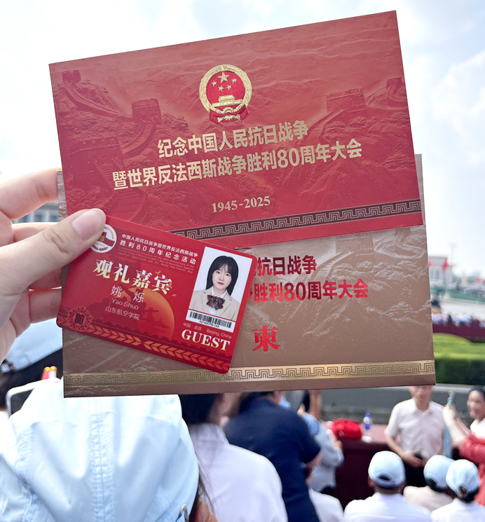 姚烁作为新时代烈士遗属代表,受邀赴京参加九三阅兵观礼。9月1日上午,县退役军人事务局、县公安局和山东航空学院在县退役军人事务局为她举行了简短的欢送座谈会,祝贺她代表家乡参加国家这次重大活动,姚烁对能参加举世瞩目纪念活动激动万分,对组织的关怀和厚爱深受感动。