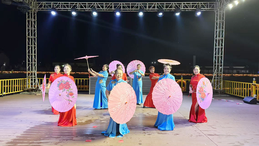 红色经典与传统雅韵共舞。旗袍秀《高天上流云》在水中舞台缓缓映入眼帘,身着典雅旗袍的表演者们,步履款款,身姿曼妙,将东方女性的温婉与端庄展现得淋漓尽致;男声合唱《游击队之歌》铿锵有力,熟悉的旋律唤起了在场观众对峥嵘岁月的追忆;现代京剧《江姐》选段《红梅赞》将江姐坚贞不屈、大义凛然的革命英雄形象栩栩如生地呈现在观众面前;广场舞《中华全家福》展现了新时代中华儿女积极向上、团结和谐的精神风貌及对国家繁荣昌盛、人民幸福安康的美好祝愿。
