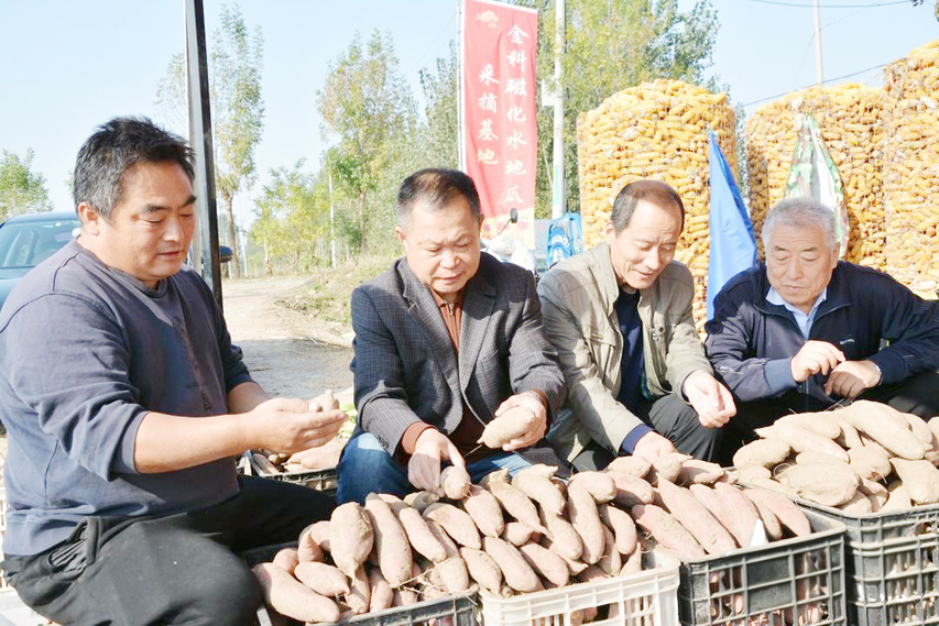 王保友(右三)正在流坡坞镇周商村查看收获的蜜薯