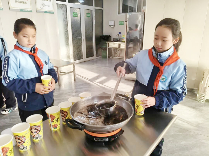 活动前夕,这场特殊的“行走思政课”在学校餐厅悄然开课。少先队员们在辅导员周倩倩老师的指导下,化身“小小厨神”开启了姜茶制作之旅。挑选新鲜生姜、仔细清洗切块、按比例搭配茶叶与冰糖,再用小火慢慢熬煮,整个过程有条不紊。少先队员们守在锅边,时不时搅拌茶汤,鼻尖萦绕着生姜与茶叶交融的清香,更将满满的敬意、真诚的关爱与朴素的感恩之心,一同熬进了这杯醇厚暖饮中,让“奉献不分大小,爱心始于点滴”的思政理念,在动手实践中深深扎根。