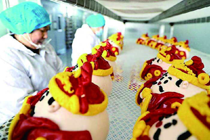 近日,在我县一家花馍生产企业的车间里,面点师正加紧制作“财神爷”造型的花馍。 随着农历马年春节临近,花馍市场迎来销售旺季。我县各花馍生产企业开足马力,赶制造型各异的花馍供应节日市场,为即将到来的新春佳节增添浓浓的喜庆气氛。 (朱超峰)