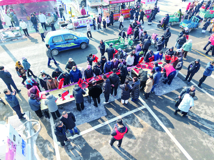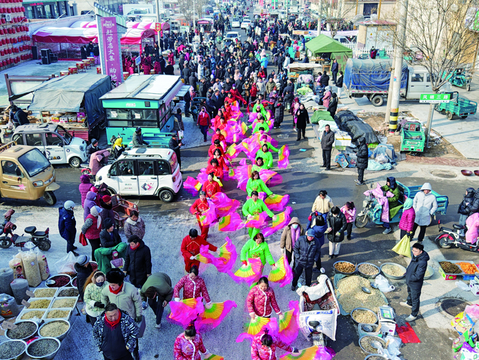 观民俗巡游·赏快闪村晚。“舞狮开场闹新春,秧歌穿梭送吉祥”,快闪村晚让大集成为流动的舞台。威武的雄狮腾跃起舞,拉开演出序幕,身着艳丽服饰的秧歌队沿着集市街巷穿梭,扭到哪里,快闪节目就演到哪里。群众自编自演的节目轮番登场:歌曲《拜新年》传递新春祝福,腰鼓舞《张灯结彩》跳出红火气象,太极剑《精忠报国》展现刚健风骨,舞蹈《吉祥中国年》洋溢欢乐氛围……让大家在逛集品美食的同时,尽享视听盛宴。劳店镇众多本土网红也纷纷来到现场开启直播,为家乡宣传助力。