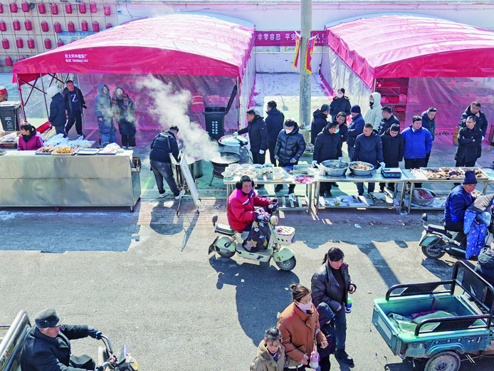 品特色村席·尝团圆滋味。大集中央的美食区香气扑鼻,劳店镇特色村席热闹开席。现场支起的大铁锅咕嘟作响,八小时慢熬的羊汤汤色清亮、鲜而不膻,搭配卤制猪下货、香酥炸货等特色美食,让居民游客大快朵颐。大家围坐在一起,边品尝地道乡味边闲话家常,还能看村晚,热气腾腾的美食不仅暖胃,更拉近了邻里情谊,尽显团圆年味。