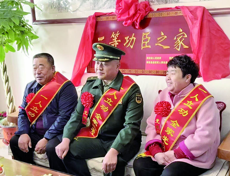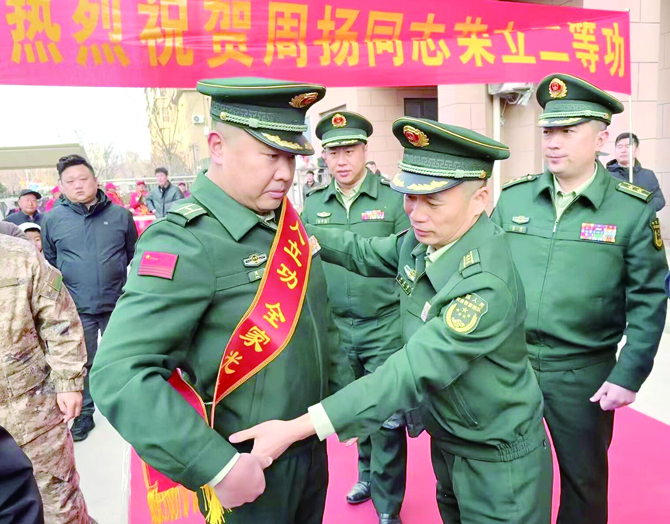 “老周同志,您的孩子周扬在部队荣立了二等功,我们送喜报来了!”周扬所在部队、县人武部领导,副县长、县公安局党委书记、局长韩志明,金阳街道党工委书记马丽,县退役军人事务局党组书记、局长杨洪彬等军地领导,专程来到厚德宜居小区,一边向家属祝贺,一边为他们披红戴花,送上立功牌匾、喜报、慰问金和慰问品。